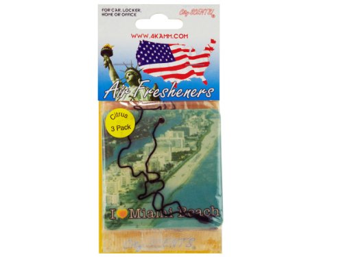 #Have some fun with air fresheners with these fun fresheners. Each package contains 3 air fresheners, all with a picture of the Miami beachline. Each says "I (heart) Miami". Each also includes a string so these can be hung in the car, locker, home or office. Each measures 3" x 3".
